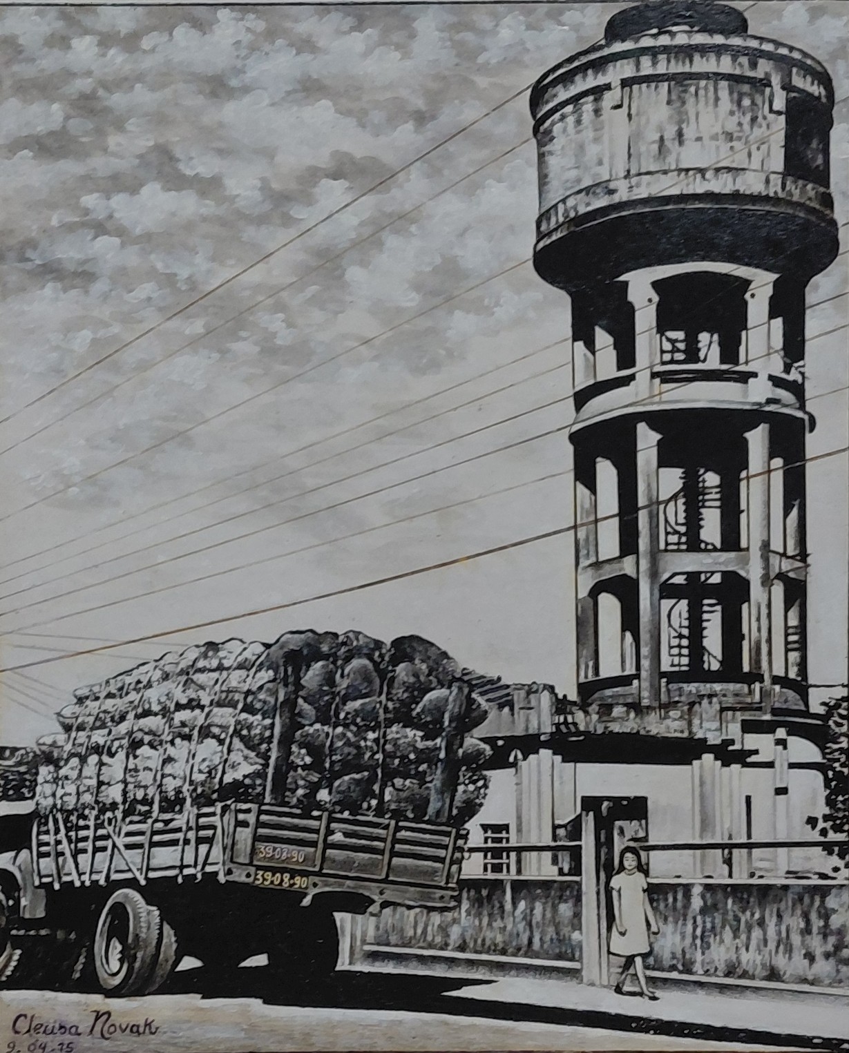 Retrata o prédio principal do antigo Departamento de Água e Esgoto de Marília (DAEM), localizado na Rua São Luiz, no centro da cidade. Destaca-se sua torre de abastecimento (caixa d'água) em tons monocromáticos. Em primeiro plano, um caminhão carregado e uma figura feminina caminhando junto ao muro adicionam vida ao ambiente urbano, enquanto as linhas dos fios elétricos e o céu nublado complementam a cena.
