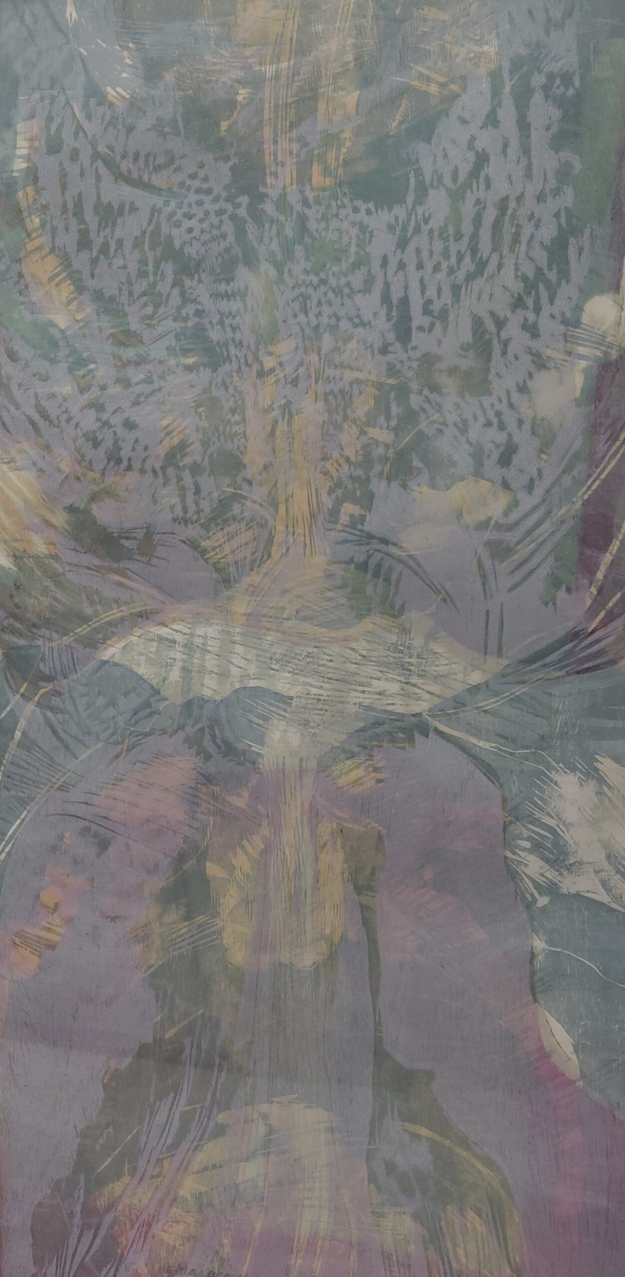 Apresenta uma composição abstrata marcada por sobreposições de cores frias — predominantemente verdes, azuis e lilases — que se misturam a tons mais claros, criando uma atmosfera etérea e quase translúcida.