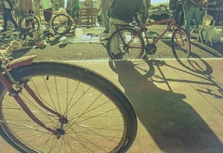 Apresente um ambiente de feira ao ar livre, capturado sob luz intensa que projeta longas sombras. Em primeiro plano, destaca-se a roda de uma bicicleta, enquanto ao fundo outra bicicleta vermelha se sobressai entre pessoas e objetos expostos no chão.