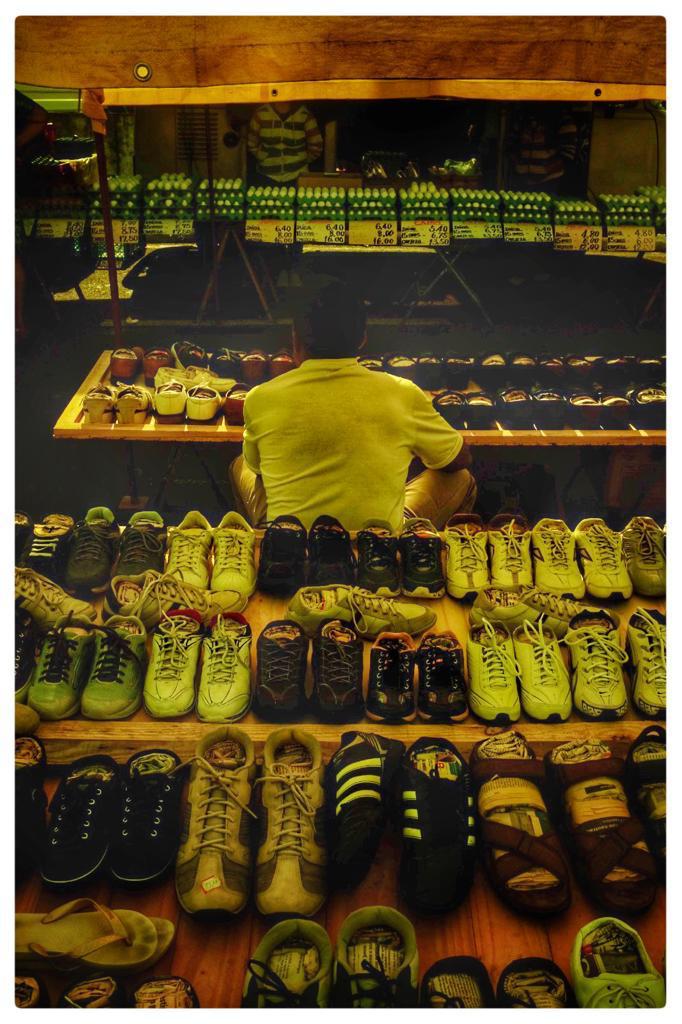 Retrata um vendedor de costas, vestindo uma camisa clara, sentado diante de sua barraca de calçados. Os sapatos e tênis estão organizados em fileiras sobre uma estrutura de madeira, alguns com etiquetas de preço. Ao fundo, há outra barraca vendendo ovos, com preços expostos em pequenas placas.