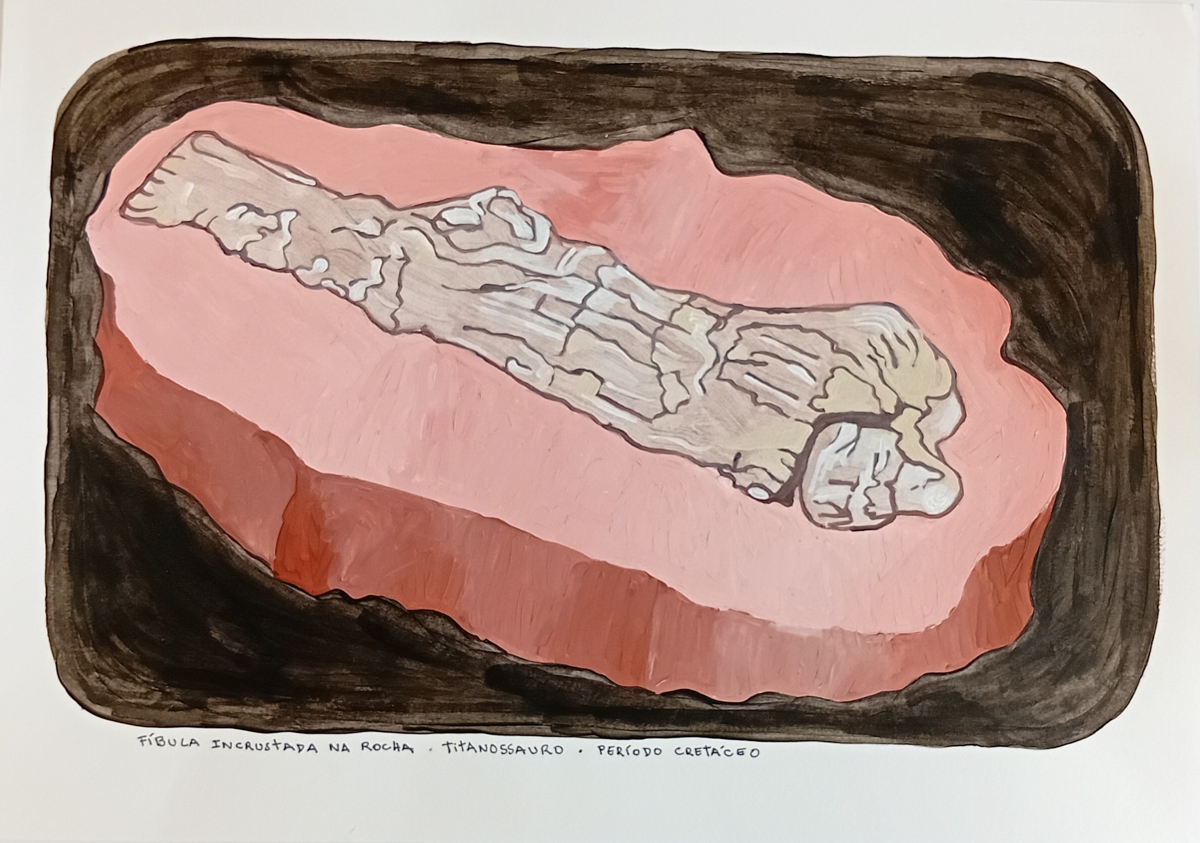 Apresenta a representação de uma fíbula de titanossauro incrustada na rocha, evocando um vestígio fossilizado do período Cretáceo, destacado por um núcleo em tons rosados que contrasta com a moldura escura ao redor. O osso, delineado com traços orgânicos e fissuras sutis, sugere a passagem do tempo e os processos geológicos.