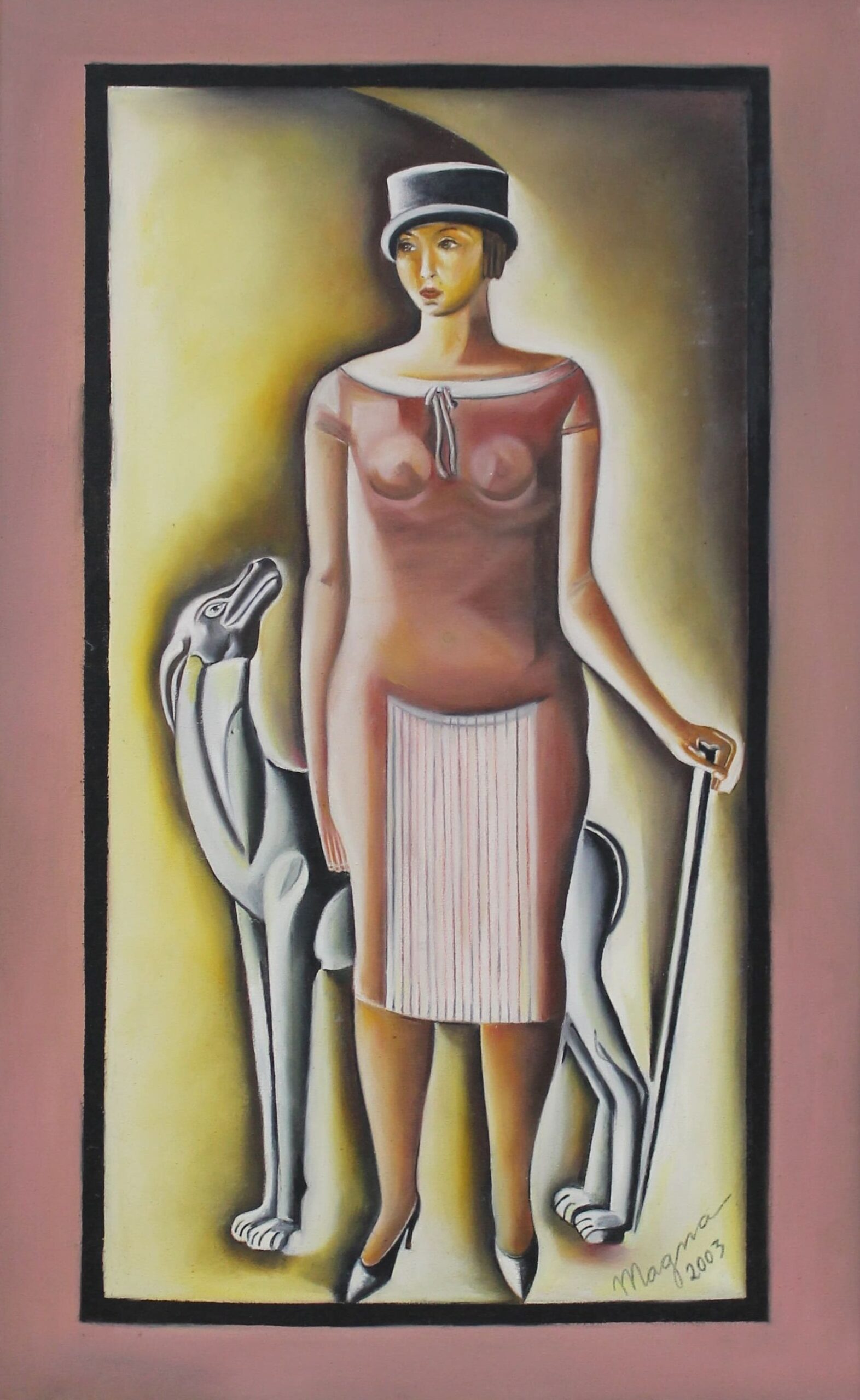 A pintura retrata uma mulher de expressão serena, vestindo um traje elegante em tonalidade rosada e um chapéu preto com detalhes brancos. Ao seu lado, um galgo de aparência esguia e postura atenta reforça a sofisticação da cena. Segurando uma bengala com firmeza, a figura feminina exala imponência e refinamento. O fundo, composto por tons dourados e sombreados, cria um efeito de iluminação sutil, realçando os contornos suaves e geométricos da personagem. A composição evoca com elegância o espírito da década de 1920.