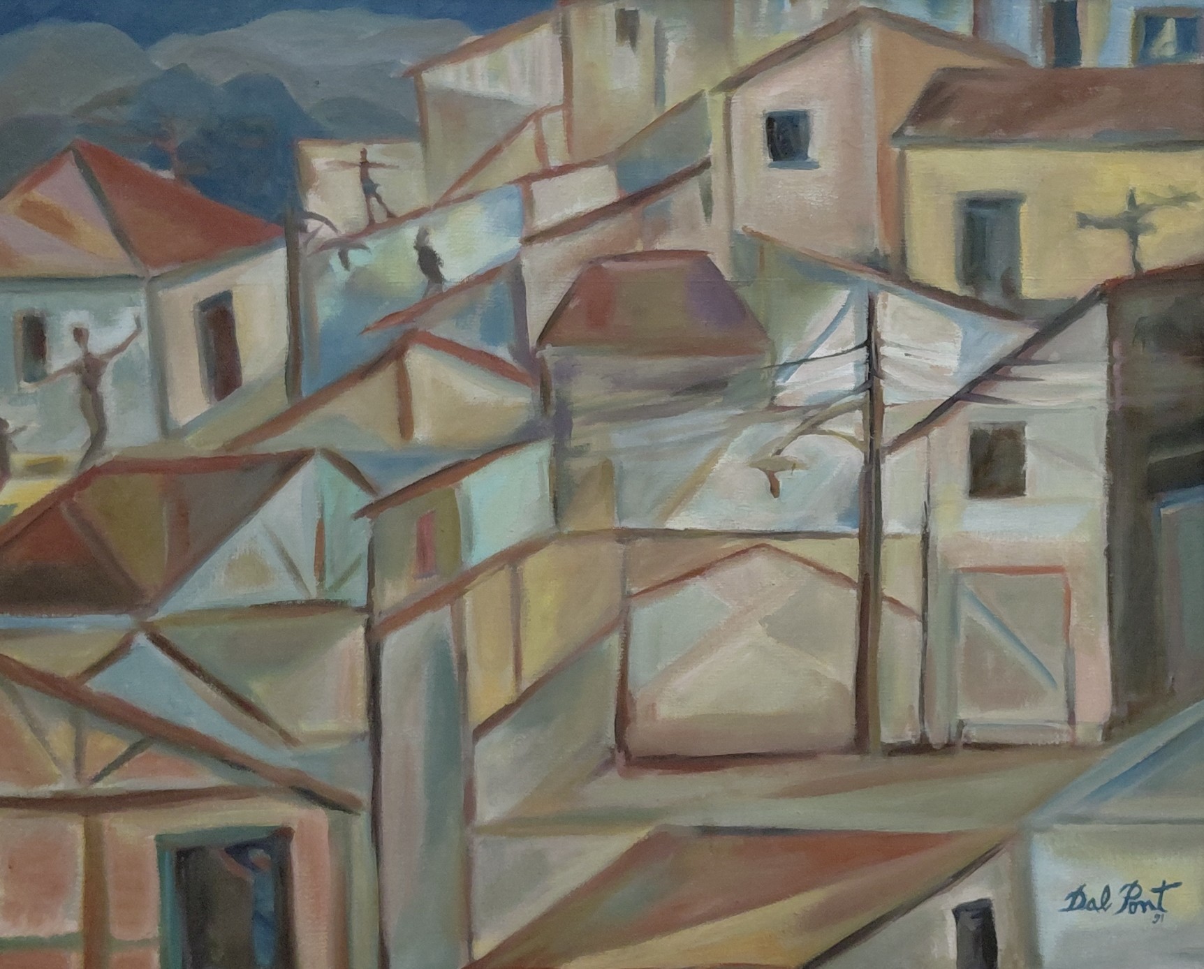 Apresenta uma paisagem urbana construída por volumes geométricos e planos sobrepostos, sugerindo um aglomerado de casas dispostas em diferentes níveis. As edificações, em tons suaves de ocres, azuis e rosados, criam um jogo de luz e sombra. Pequenas figuras humanas surgem de forma sutil, integradas ao cenário.