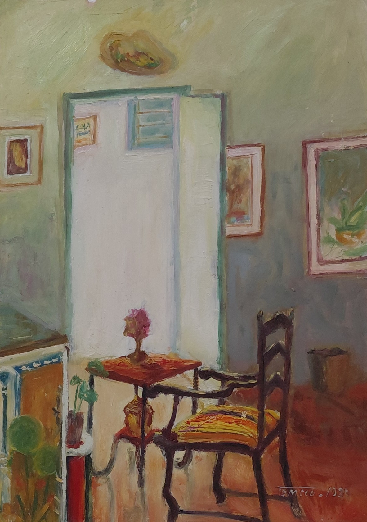 Retrata um ambiente doméstico. No centro, uma mesa pequena com um arranjo floral repousa ao lado de uma cadeira de madeira escura. As paredes, em tons esverdeados e azulados, exibem quadros que reforçam a atmosfera artística do recinto. Ao fundo, uma porta entreaberta e uma janela deixam entrever luz difusa.
