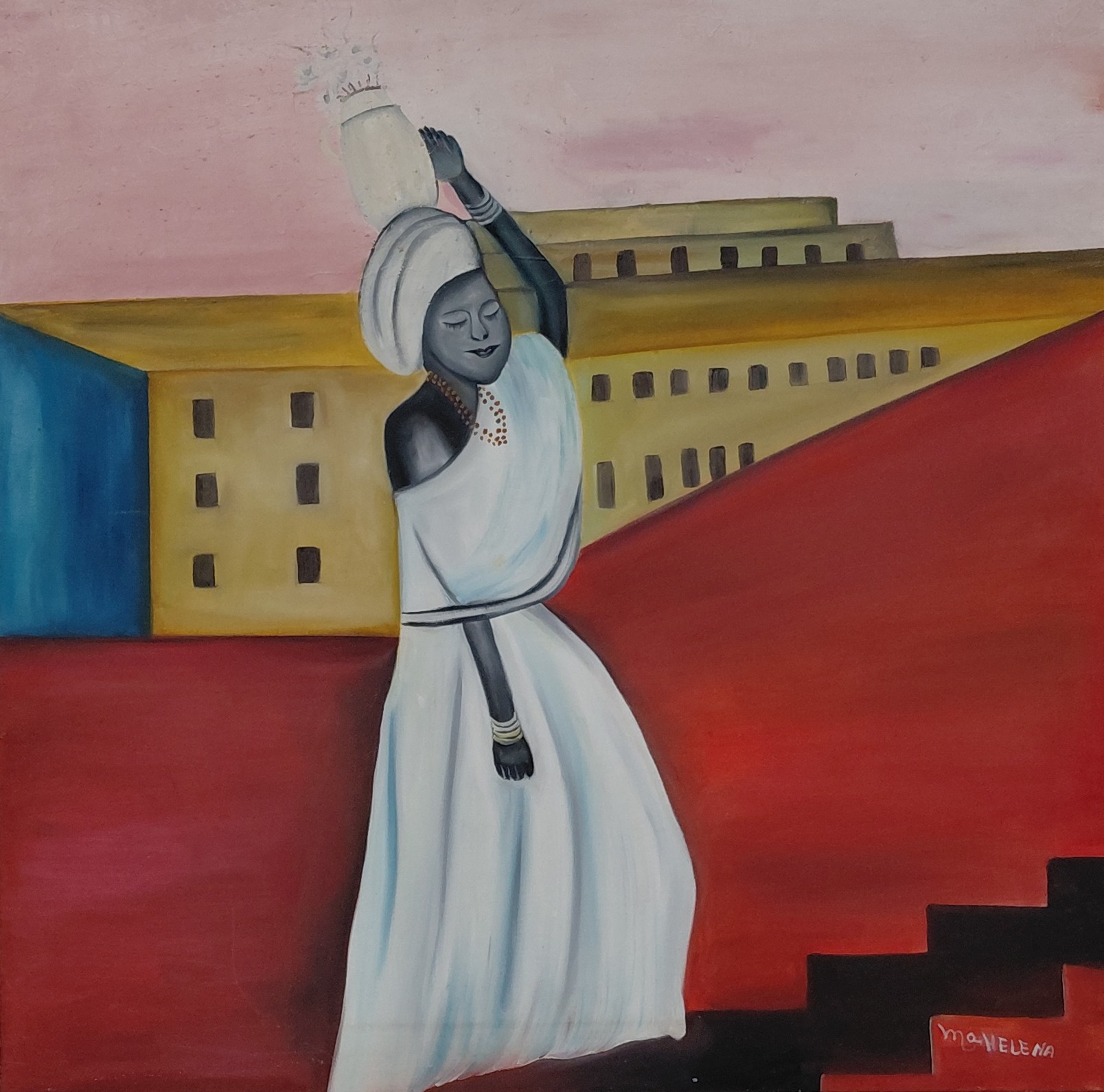 Retrata uma mulher vestida de branco, com turbante e colares que remetem à figura da baiana, equilibrando um vaso sobre a cabeça. Ela caminha por uma escadaria vermelha, em meio a construções geométricas em tons de ocre e azul, sob um céu rosado.
