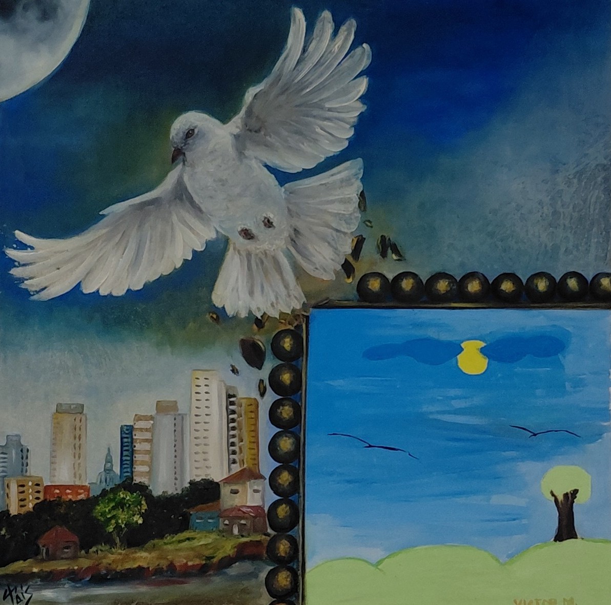 A partir desse ponto, a artista amplia a narrativa visual, inserindo uma pomba branca em pleno voo que parece emergir da moldura da pintura infantil, rompendo suas bordas e adentrando o espaço do restante da tela. Ao fundo, revela-se uma paisagem urbana do município de Marília, com prédios altos e casas próximas a uma área verde, iluminadas pela luz da lua.
