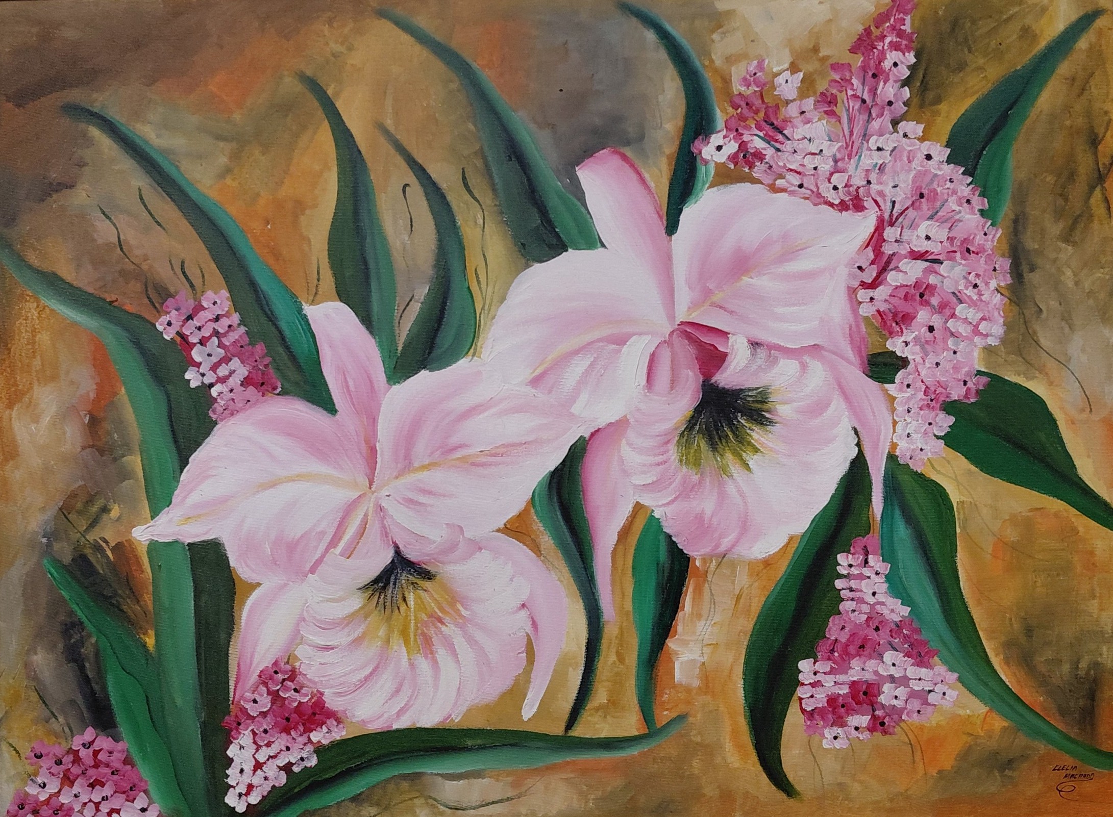Apresenta uma composição de flores em tons de rosa suave, destacando duas grandes orquídeas no centro da cena, envoltas por folhagens verdes e delicados ramos floridos. O fundo traz nuances terrosas, com variações de ocre e marrom.