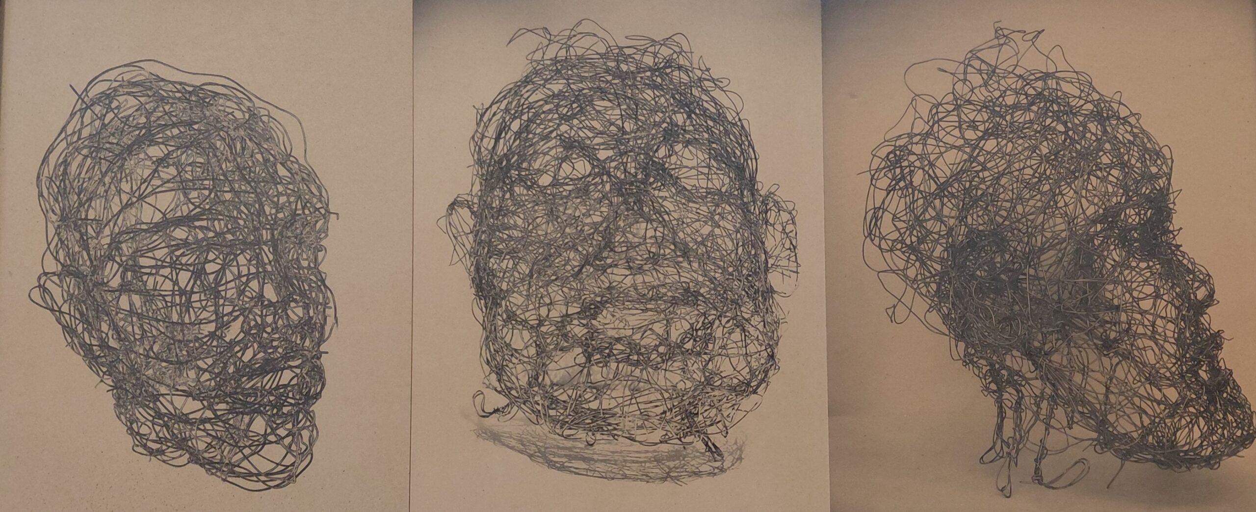 Apresenta três vistas de uma mesma cabeça modelada com fios metálicos entrelaçados, configurando volumes e vazios que sugerem as feições humanas.
