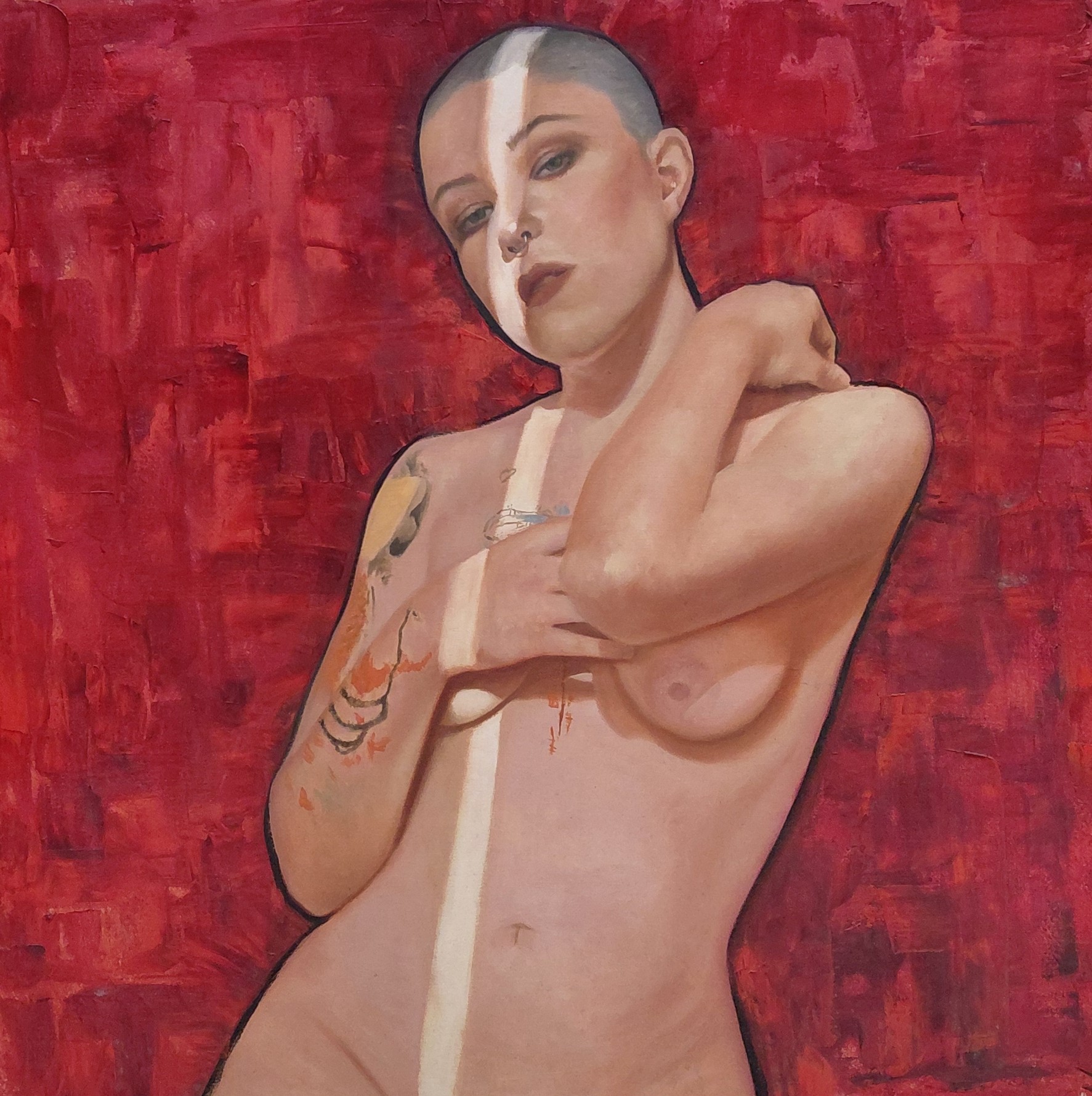 Obra com fundo predominantemente vermelho vivo, composto por pinceladas visíveis e sobreposições de tonalidades. Ao centro, há a figura de uma mulher de pele clara e cabeça raspada, representada de meio corpo.