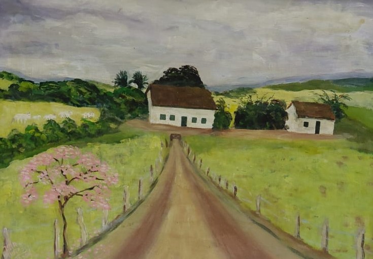 Traz a representação de uma paisagem rural. Ao centro, uma estrada de terra se estende em perspectiva, conduzindo o olhar até duas construções brancas com telhados em tom marrom-avermelhado. A casa maior está posicionada levemente à esquerda, enquanto uma construção menor aparece à direita, ambas cercadas por áreas verdes. Nos campos ao redor, predominam tonalidades de verde claro e escuro. À esquerda da composição, há vegetação mais densa e algumas figuras brancas que sugerem animais no pasto. Em primeiro plano, à esquerda, destaca-se uma árvore com flores rosadas. O céu apresenta tons acinzentados e azulados suaves, compondo uma atmosfera tranquila e campestre.
